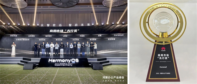 凭借和鸿蒙的深度共建和商用产品落地成果,Coremail获得鸿蒙颁发的商用市场“先行奖”,彰显了行业对Coremail技术实力与合作价值的高度认可。